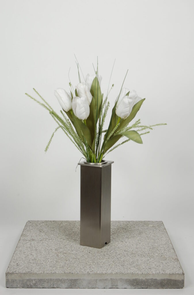 Aus Edelstahl gefertigte „moderne Grabvase“ mit geschliffener, passivierter und geölter Oberfläche. Mit Edelstahlvaseneinsatz und zur Befestigung am Sockelstein, mittels mitgelieferten Montageschrauben, vorbereitet.