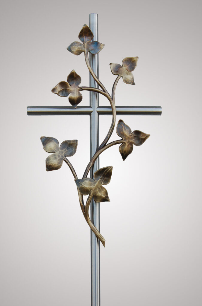 Aus Edelstahlrundmaterial gefertigtes Kreuz, geschliffen, passiviert und geölt mit geschmiedeter Bronze-Efeuzweig. Zur Befestigung am Sockelstein sind Montagezapfen (M12x140mm) vorbereitet.