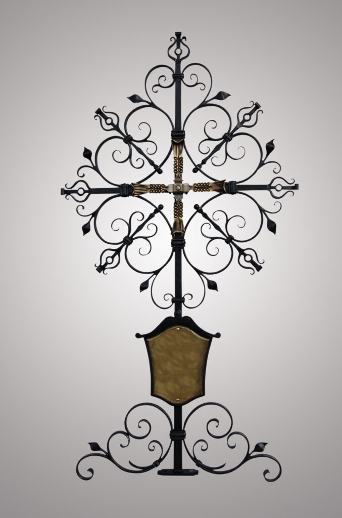 Von Hand geschmiedetes Grabkreuz aus Stahl, verzinkt, grundiert, schwarz matt lackiert und silber patiniert. Mit Bronze- Applikationen im Kreuzzentrum, ohne Grabtafel. Inkl. Montagezubehör.