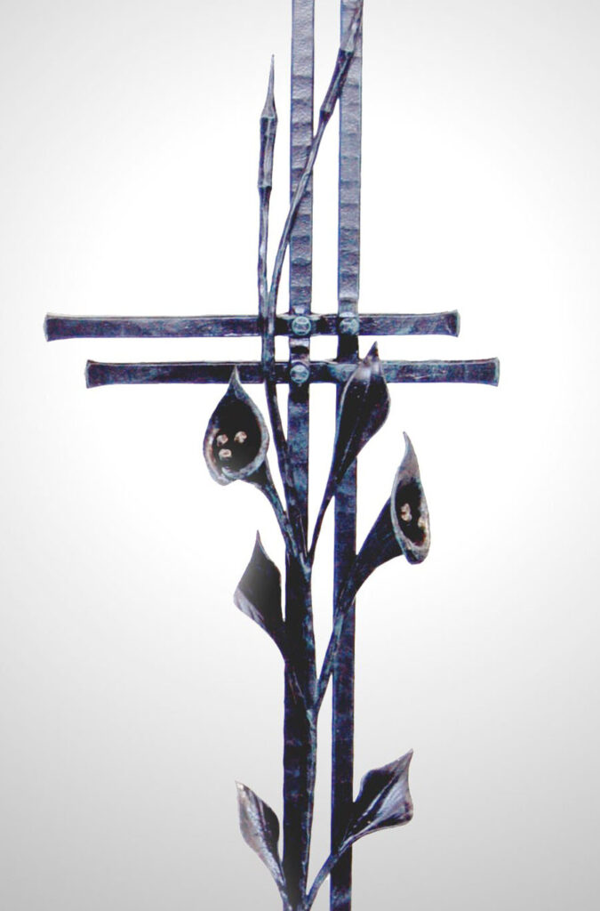 Ungleichschenkeliges Doppelkreuz aus Vierkantmaterial geschmiedet, ineinander gesteckt und vernietet. Von Hand geschmiedete stilisierte Blüten und Knospen zieren das Kreuzzeichen. Die Oberfläche ist verzinkt, grundiert und lackiert. Zur Befestigung am Sockelstein, mittels mitgelieferten Montageschrauben, vorbereitet.