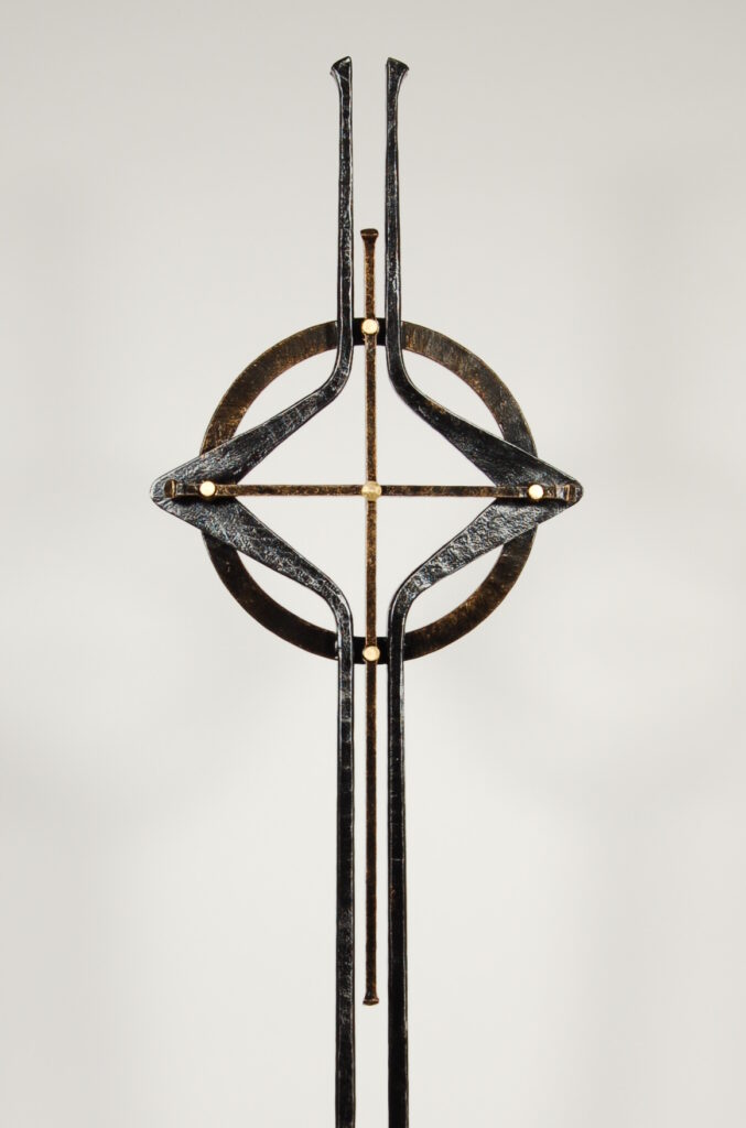 Das Grabzeichen besticht durch seine elegante Form und wirkt durch extreme Querschnittveränderungen sehr dreidimensional. Das aufgesetzte Zentralkreuz ist schlicht gehalten und wirkt streng. Alle Verbindungen sind in Niettechnik ausgeführt. Das Eisenkreuz ist verzinkt, grundiert und schwarz matt lackiert. Zur Befestigung am Sockelstein, mittels mitgelieferten Montageschrauben, vorbereitet.