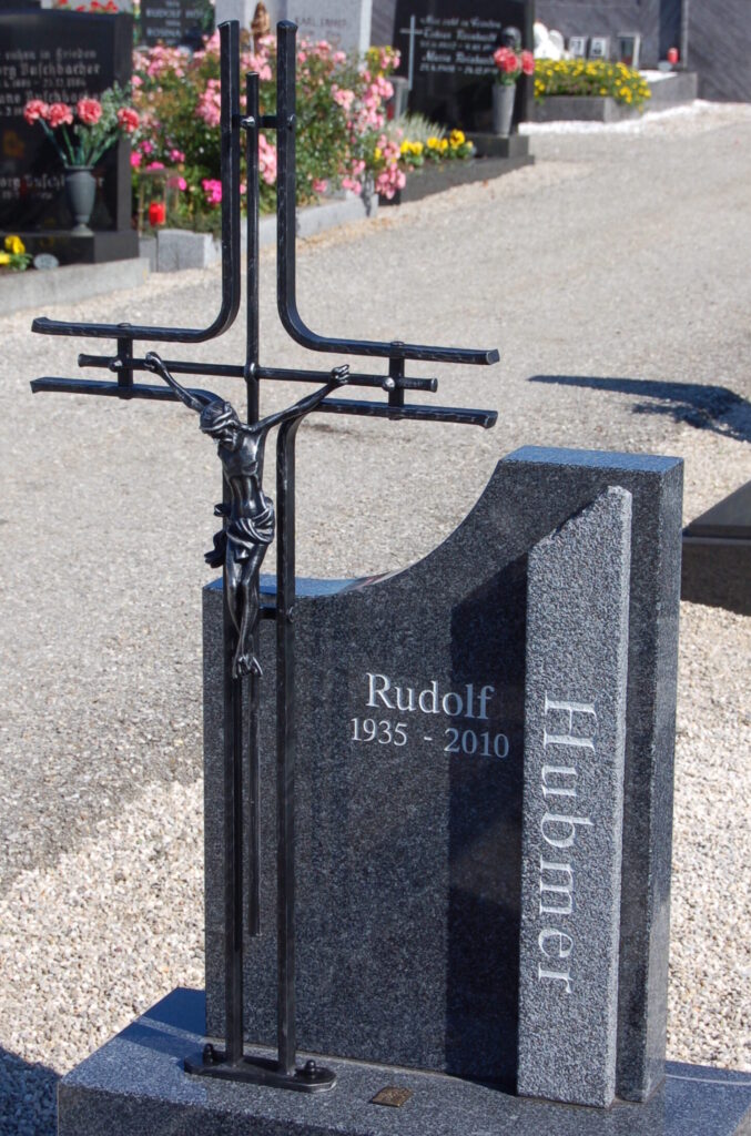 Grabkreuz in moderner Form, mit gegossenem Christuskorpus. Das Eisenkreuz ist verzinkt, grundiert und schwarz matt lackiert. Zur Befestigung am Sockelstein, mittels mitgelieferten Montageschrauben, vorbereitet.