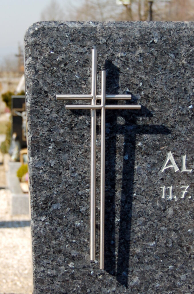 Aus Edelstahlrundmaterial gefertigtes Doppelkreuz mit geschliffener, passivierter und geölter Oberfläche. Zur Befestigung am Grabstein sind an der Rückseite Montagezapfen vorbereitet.