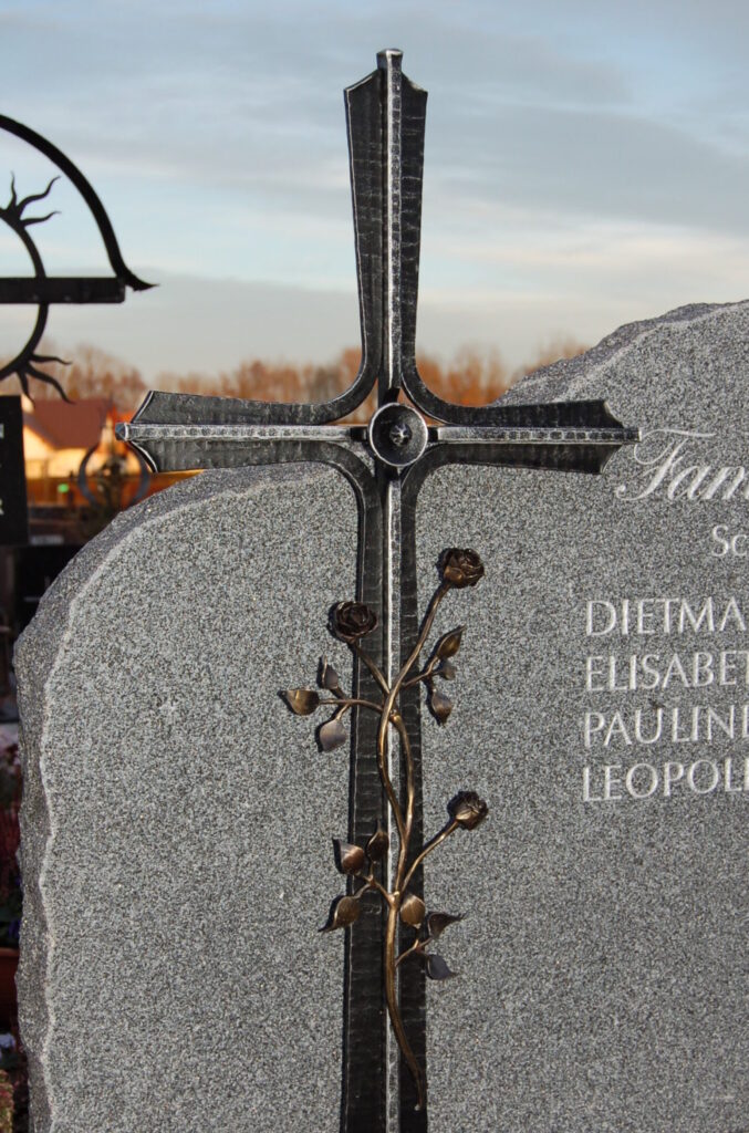 Der Kreuzstamm ist aus Stahl geschmiedet, verzinkt, grundiert und schwarz lackiert. Um die Dreidimensionalität hervorzuheben, ist das Zentralkreuz etwas heller mit silber patiniert als der restliche Kreuzstamm. Die geschmiedeten Rosen sind aus Schmiedebronze gefertigt und sind patiniert und versiegelt. Auch ohne Rosen erhältlich.