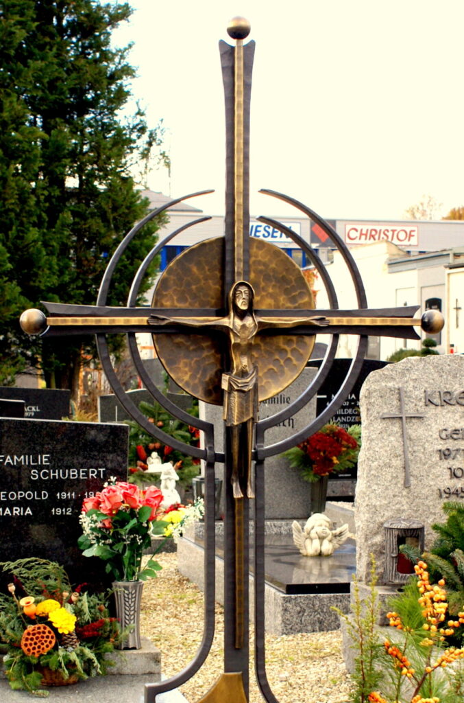 Victum Das Kreuz ist aus Stahl geschmiedet, verzinkt, grundiert und glimmerschwarz lackiert. Das Zentralkreuz, die Ronde, die Tafel sowie die Zierkugeln sind aus Schmiedebronze gefertigt, patiniert und versiegelt. Victum GK 041.1.01glimmerschwarz lackiert, Bronze, ca. 1100x 500mm.Victum GK 041.2.01glimmerschwarz lackiert, Bronze, ca.1500 x 680mm. Zurück zur Übersicht